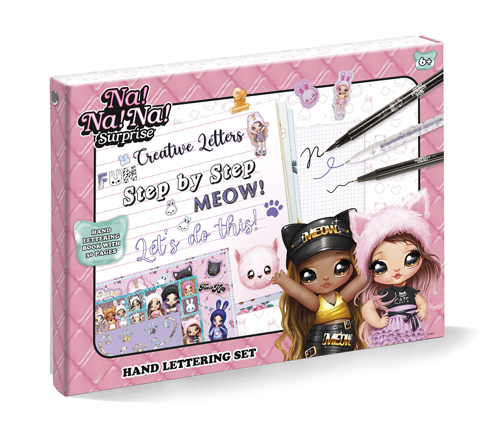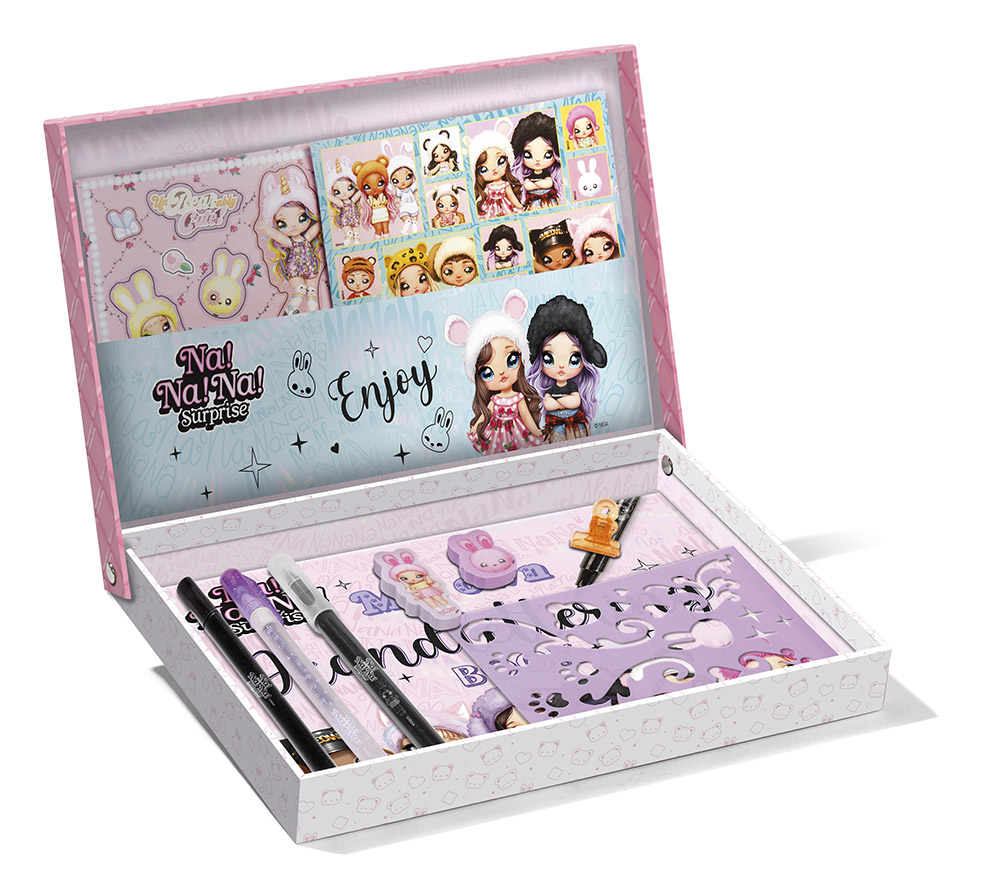Съдържа множество стикери, шаблони, печати, маркери и блестяща лилава писалка за писане на красиви писма;