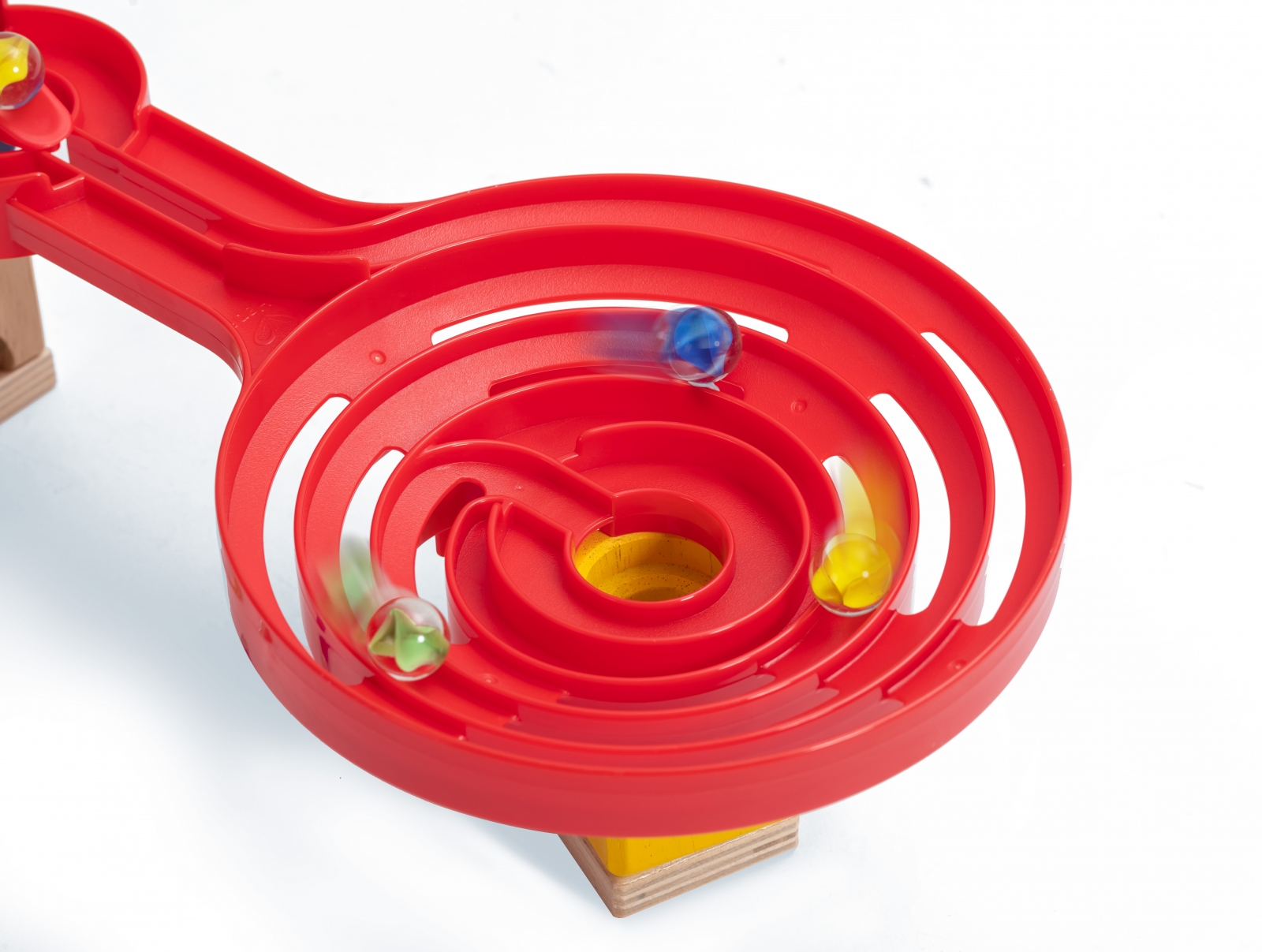 Двустранната писта означава, че както вдлъбнатата, така и изпъкналата страна в комплекта имат спираловидни улеи, удвояващи интереса към играта и учебния й потенциал за децата Ви;