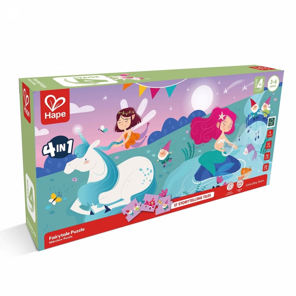 Приказният пъзел има цветни сцени с пухкави същества, принцеси, еднорог и други, с 12 плочки за разказване на истории, за да насърчите креативността на вашето дете;