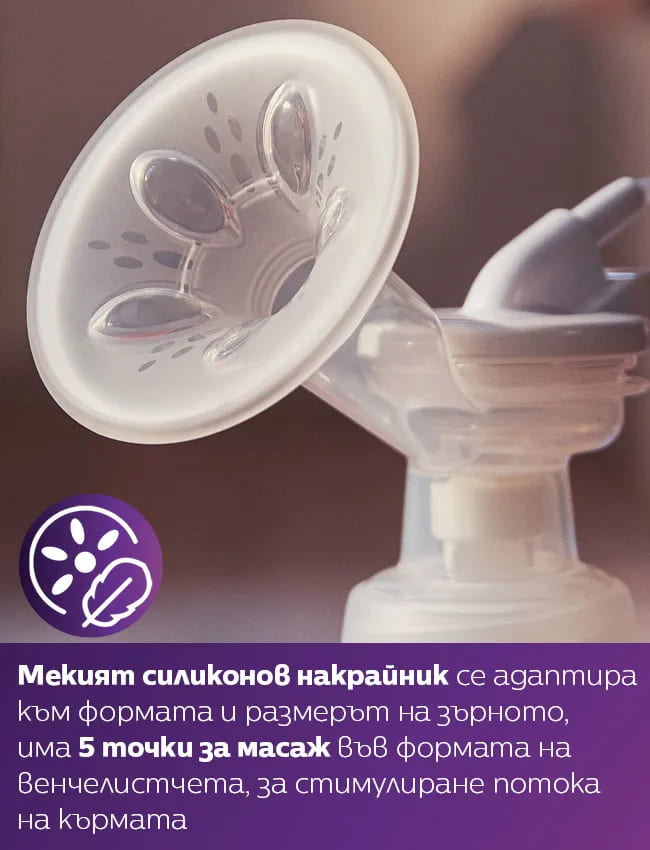 • Комфортно изцеждане - накрайникът за гърда е снабден с 5 точки за масаж във формата на венчелистчета, за стимулиране потока на кърмато;