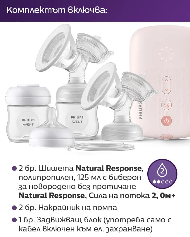 Стартов комплект Philips Avent, двойна ел. помпа 2 бр. шишета 125 мл с биберон Natural Response 0м+, 5 бр. торбички за кърма и 4 бр. подплънки-D35Nz.jpeg