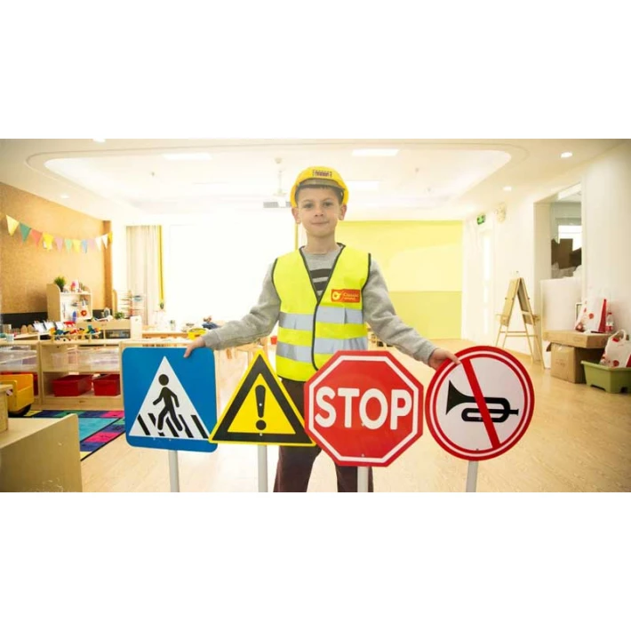 • Комплектът с детски пътни знаци е прекрасен начин, децата да научат основните правила за безопасност на пътя;