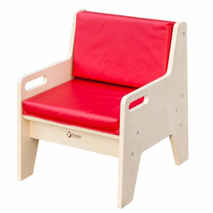 Облегалката на столчето е тапицирана в червено, което му придава мек и приятен вид;