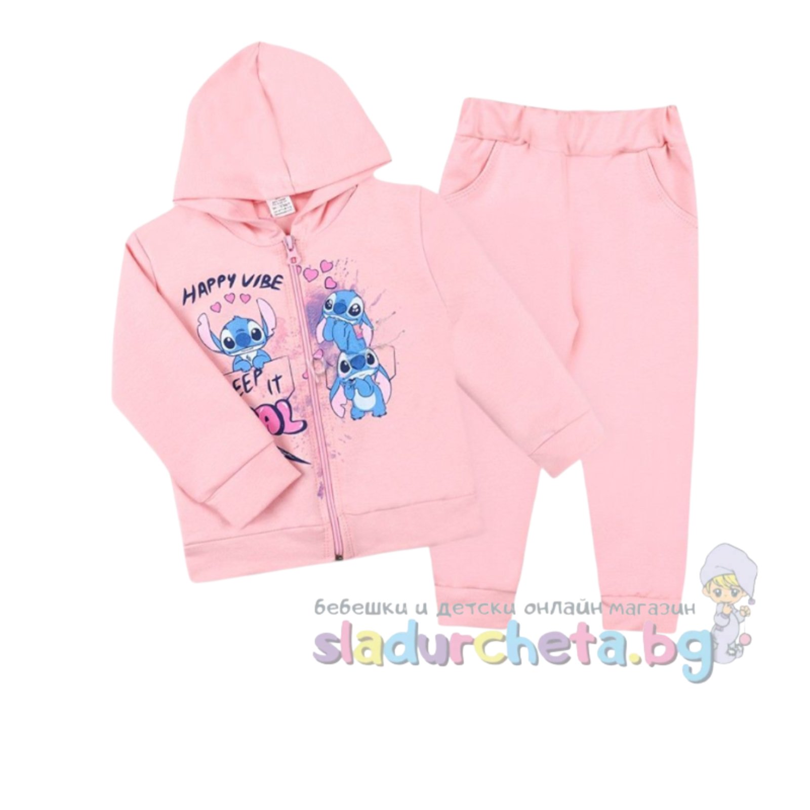 Суитшъртът е с качулка, с дълъг ръкав в цвят розова пудра с апликации на Стич;
