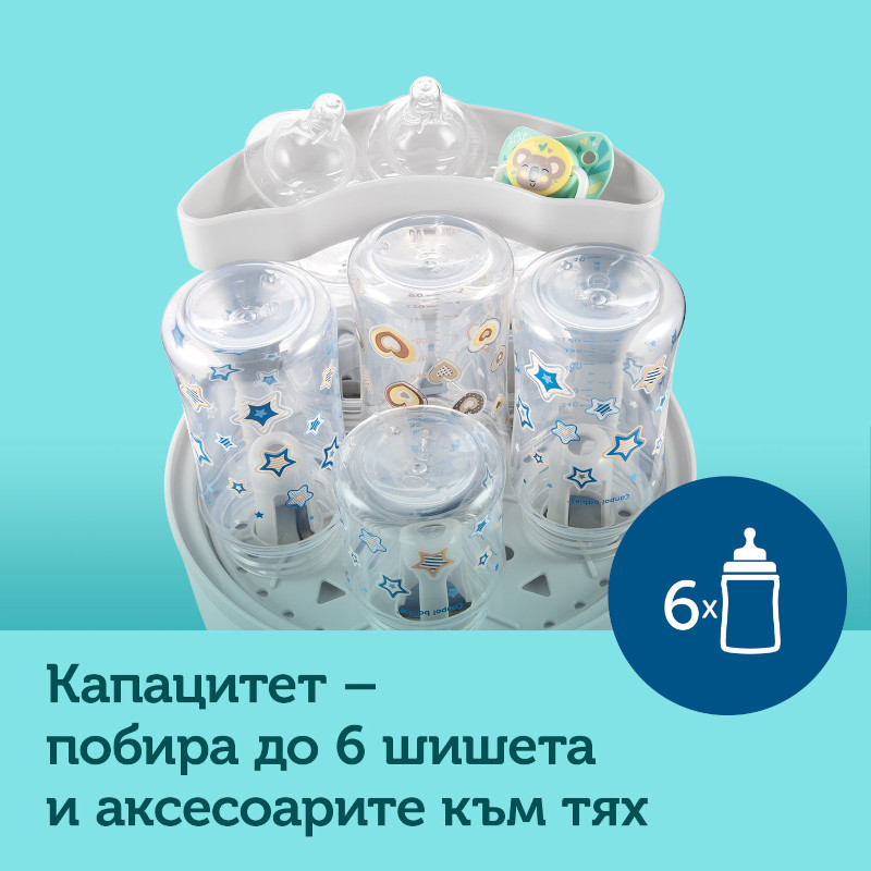 Позволява бързо и удобно да стерилизирате аксесоарите за хранене и грижи за бебето;