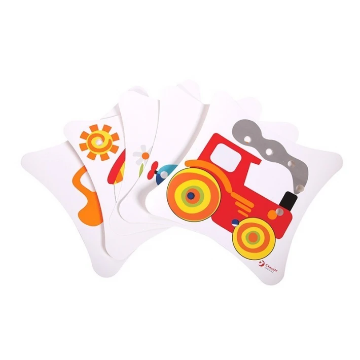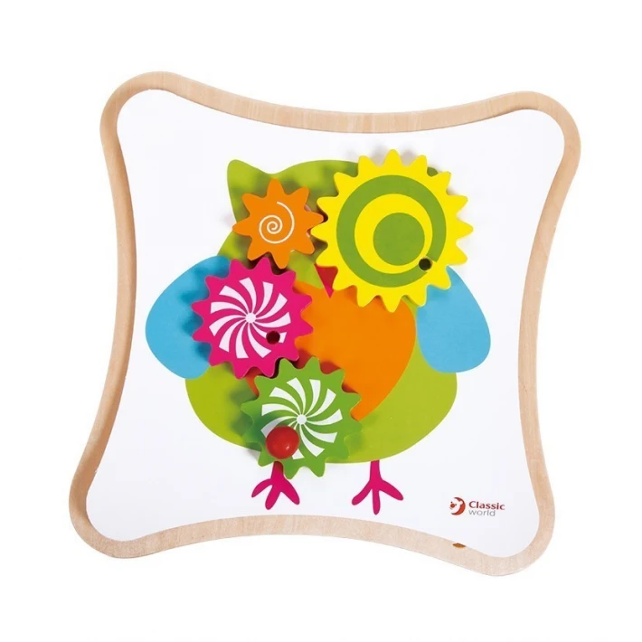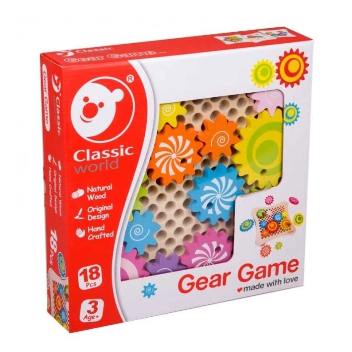 Комплектът включва 18 части - различни по големина и цвят зъбчати колела, топченца и идейни карти с картинки за довършване, добавяйки им от колелата;