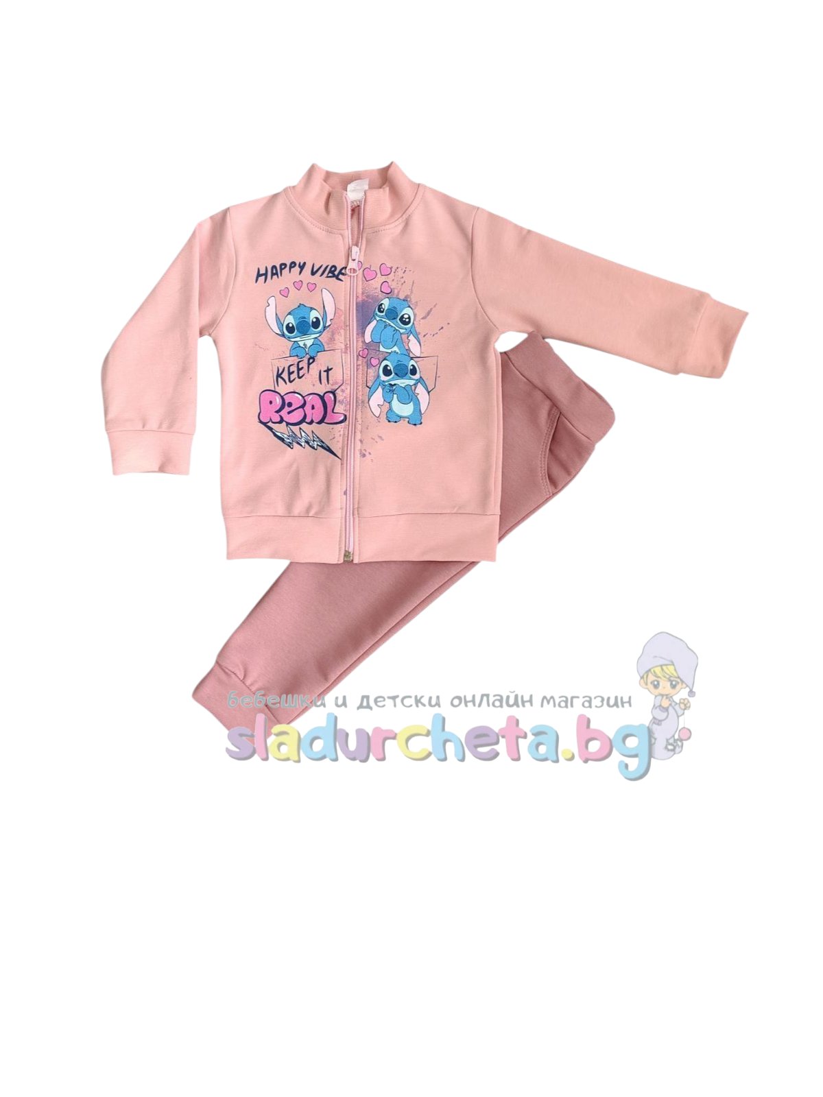 Суитшъртът е с дълъг ръкав в цвят пудра с цветна апликация на Стич;