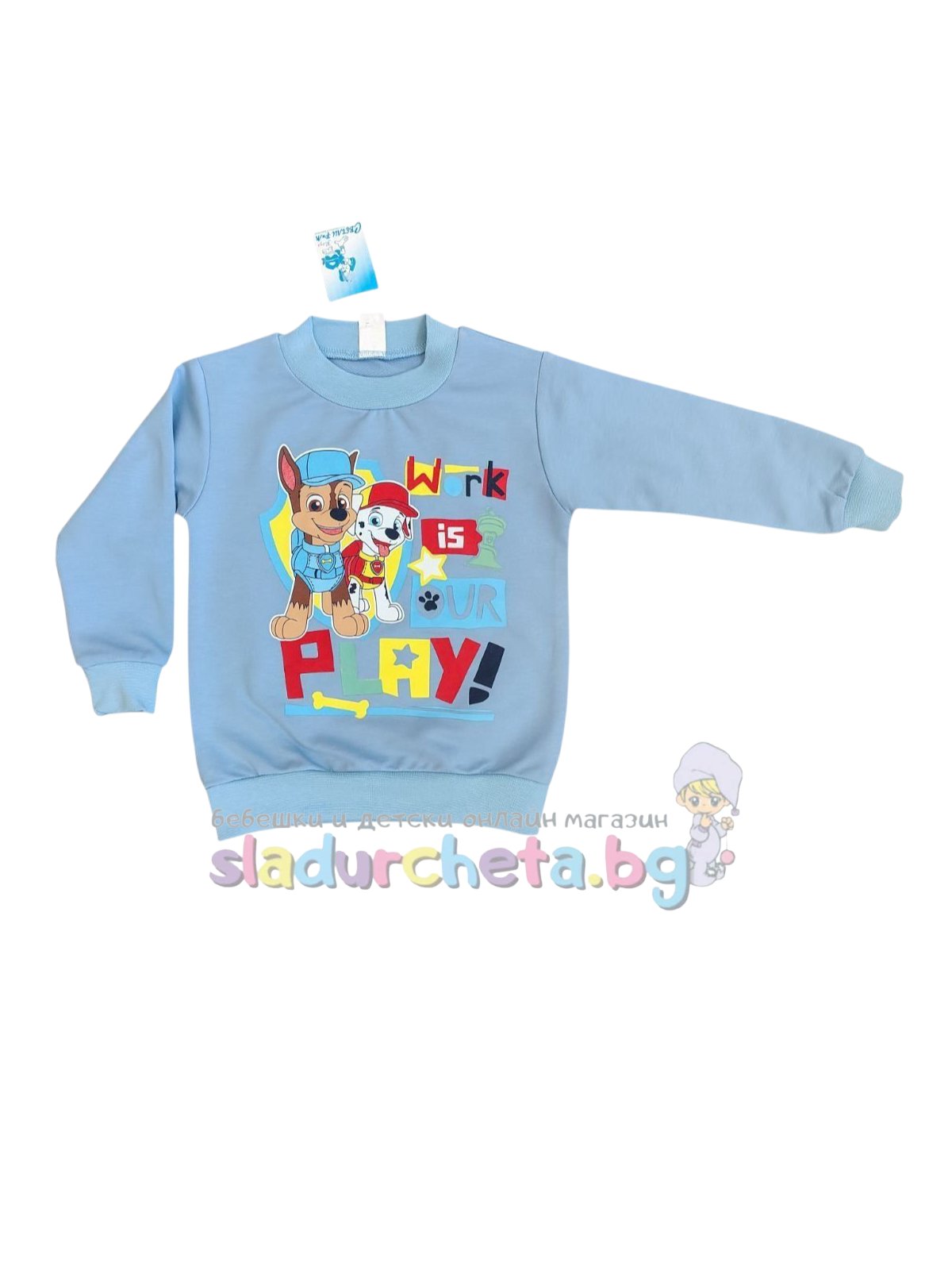 Блузата е с дълъг ръкав в светлосин цвят и цветна апликация на Пес Патрул;