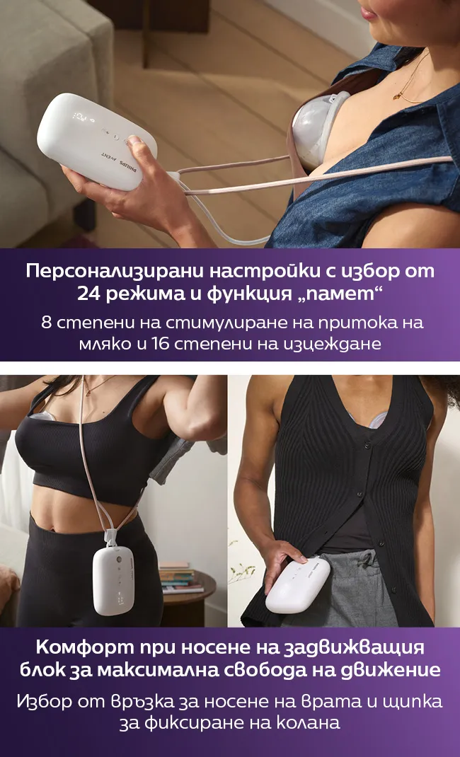 • Настройки за персонализиране: 8 степени на засмукване в режим на стимулация и 16 степени на засмукване в режим на изцеждане;