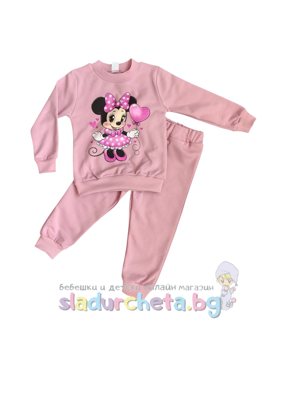 Блузата е с дълъг ръкав цвят пудра с цветна апликация на Мини Маус;