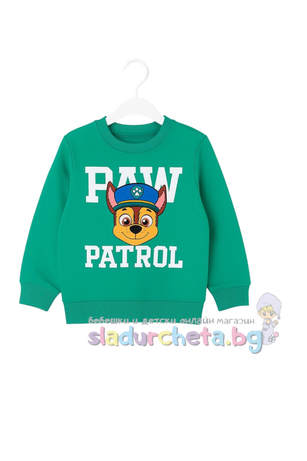 Блузата е с дълъг ръкав в зелен цвят и цветна апликация на Пес Патрул;