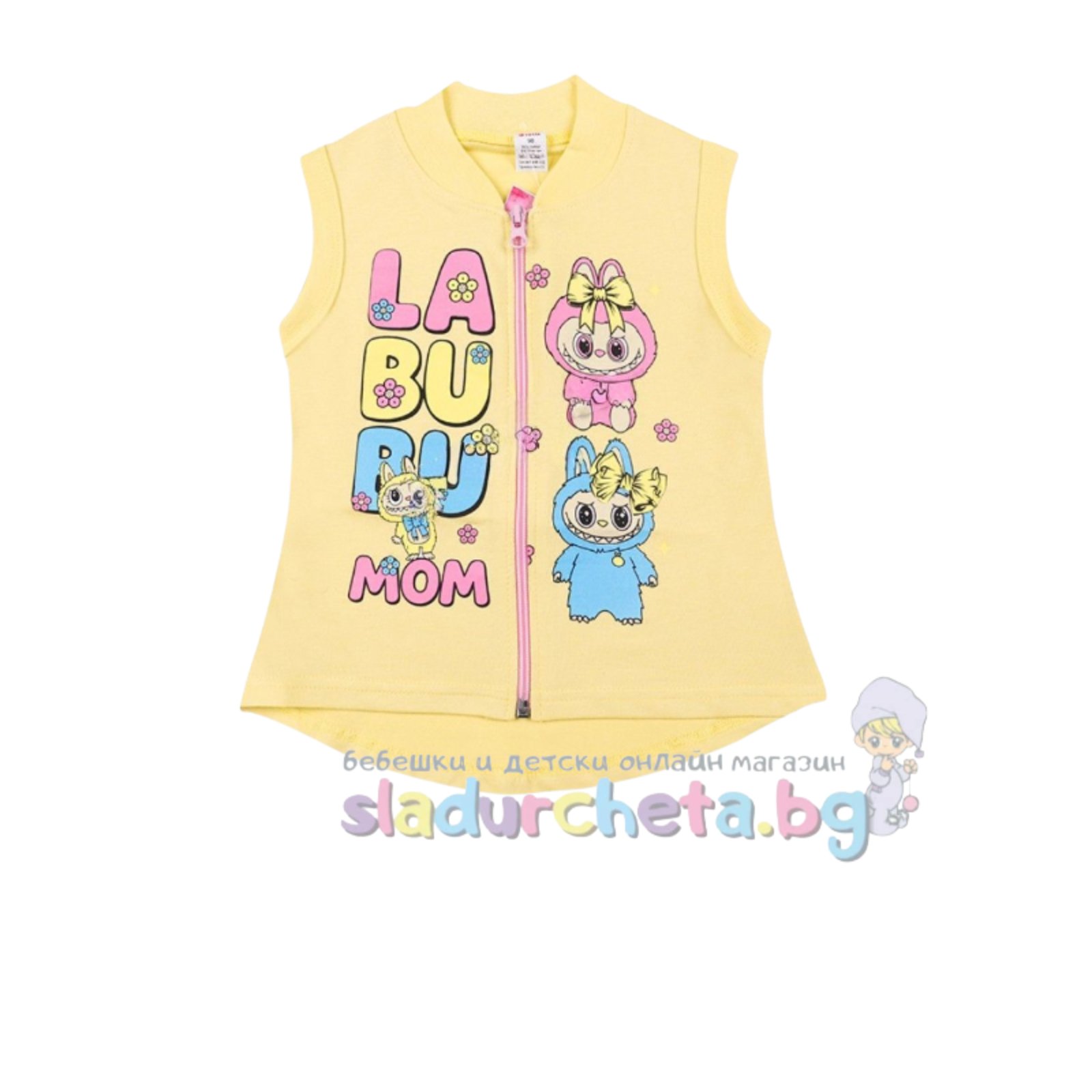 Елекът е в жълт цвят с цветна апликация на Лабубу;