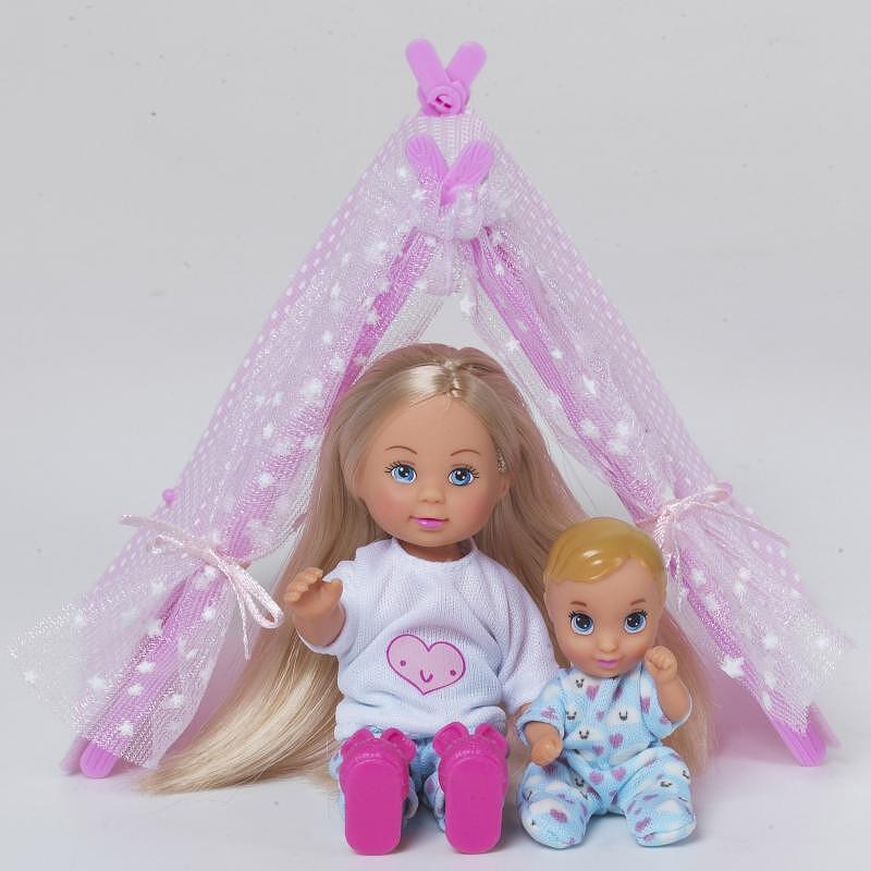 Комплектът включва аксесоари: 2 възглавници, палaтка, двуетажно легло, люлка с въртележка, играчки, залъгалка, неразливаща се чаша, чиния, прибори за хранене;
