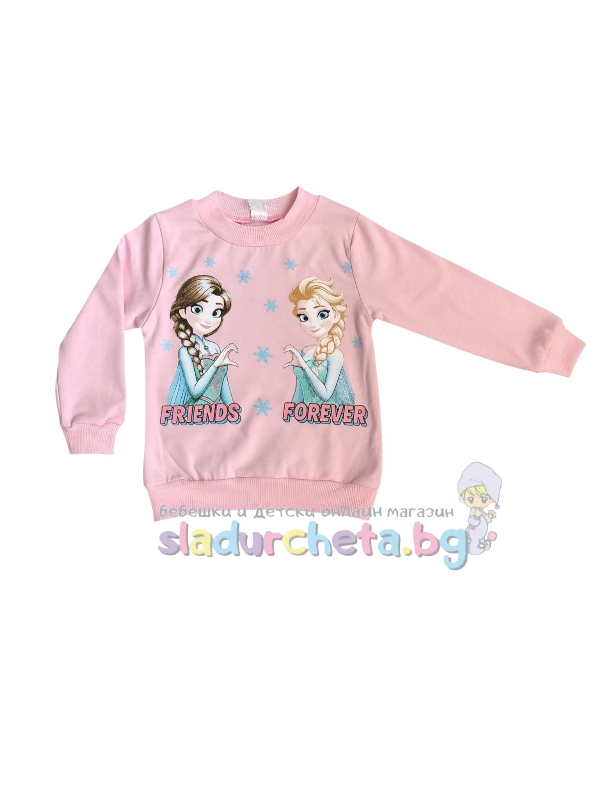 Блузата е с дълъг ръкав в светло розов цвят и цветна апликация на Елза и Анна;