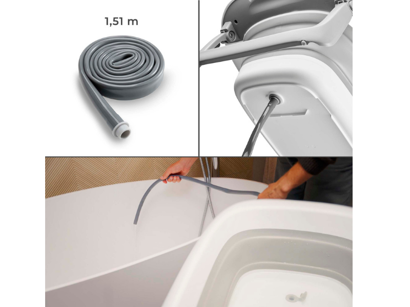 • Ваната има практичен оттичане с маркуч с дължина 151 см, което позволява лесно да източвате водата директно в мивката или ваната, без излишни усилия;