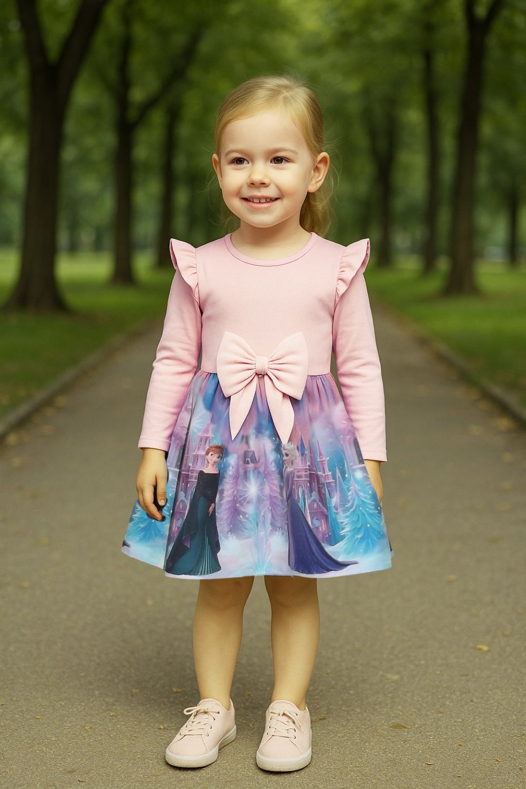 Долната част на роклята е с цветна апликация на Елза и Анна;