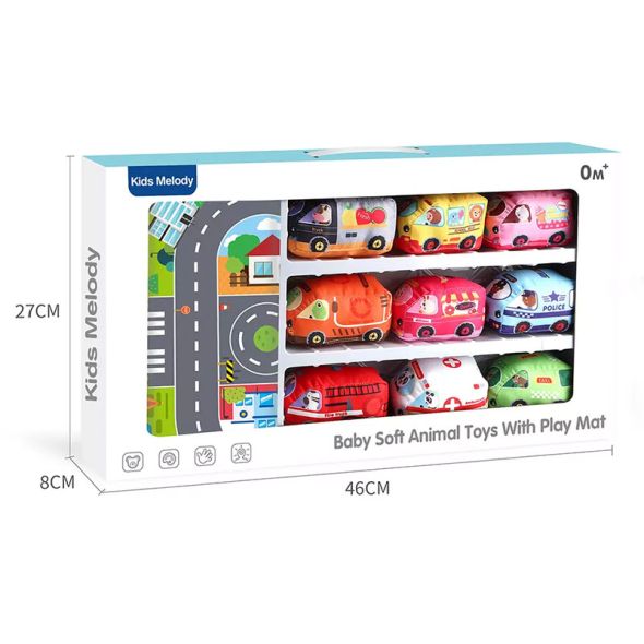 В комплекта са включени 6 меки превозни средства за игра, които бебето може да бута по килимчето;