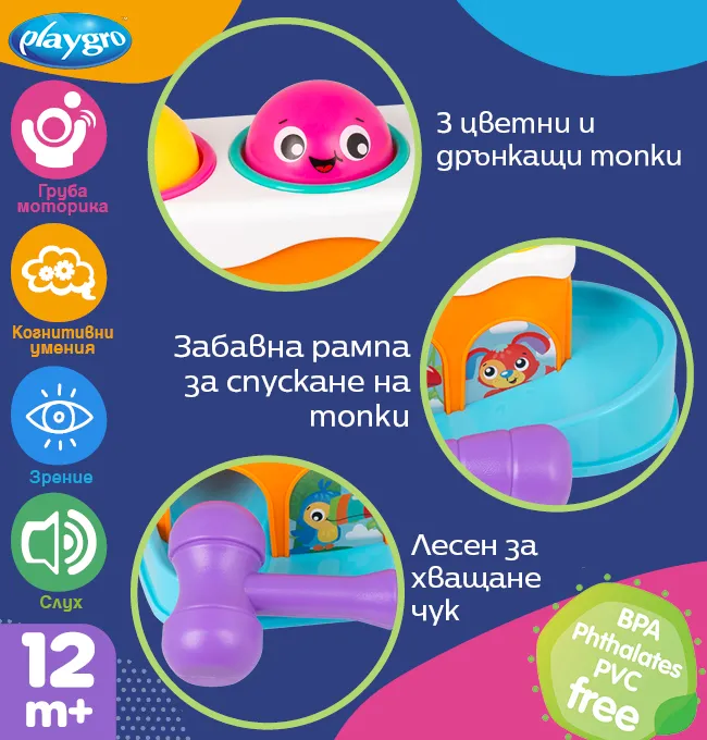 Насърчава развитието на координацията и двигателните умения на детето докато се опитва да уцели и удари топките с чукчето;