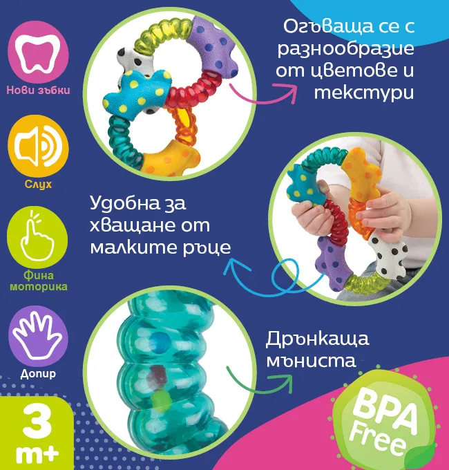 Забавни текстурирани форми, удобни за чесане на венците и за облекчаване дискомфорта в периода на никнене на първите зъбки;
