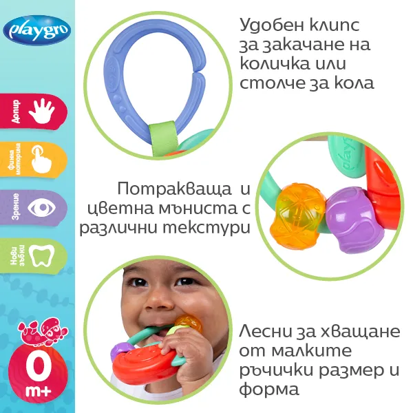 Бебешки и детски магазин "СЛАДУРЧЕТА" и марката "Playgro" представят на Вашето внимание дрънкалка със следните характеристики: