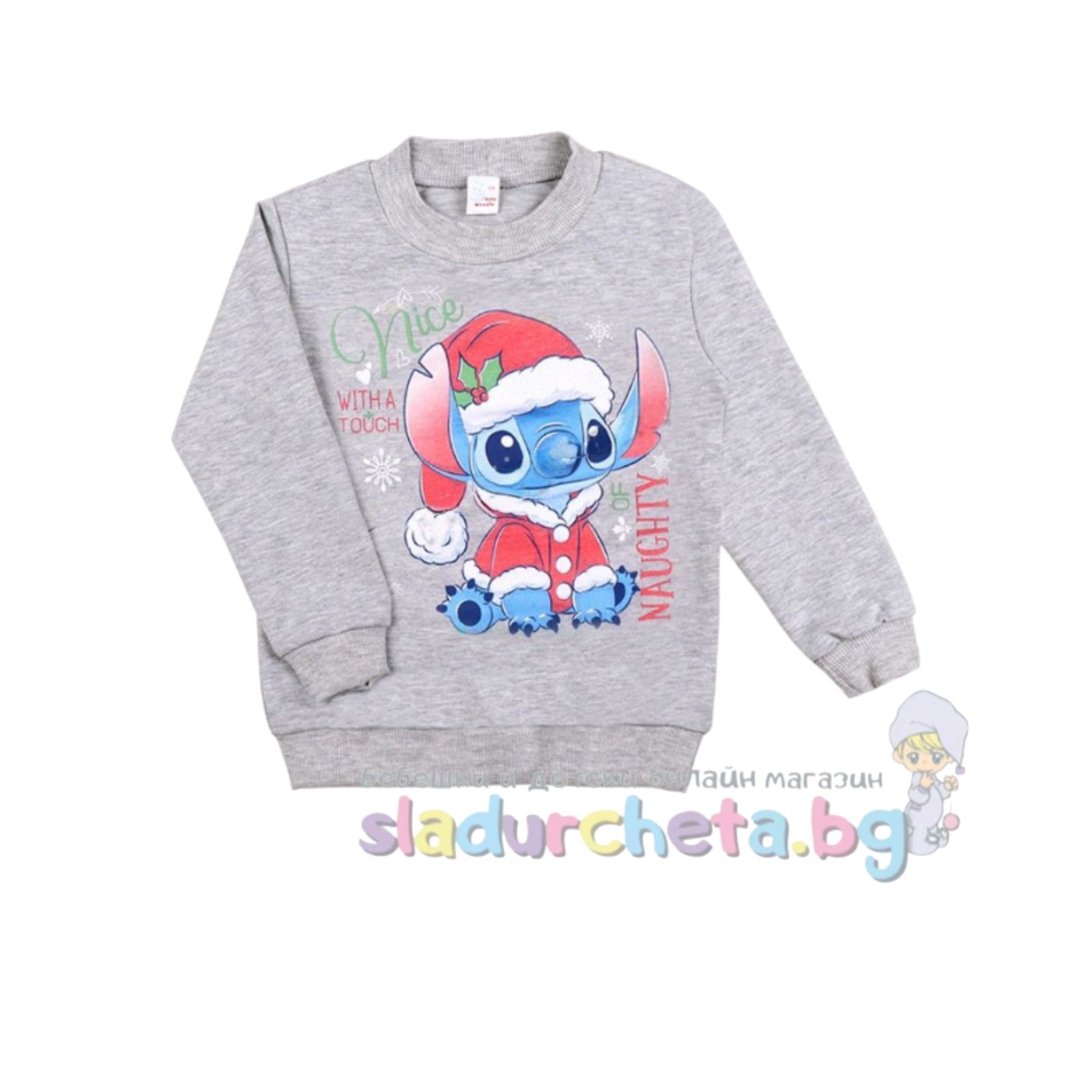 Блузата е с дълъг ръкав в сив цвят с цветна-коледна апликация на Стич;