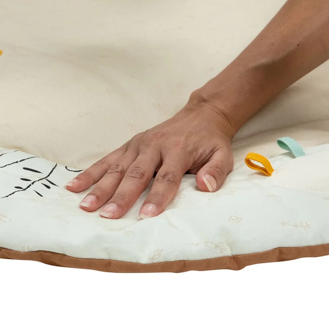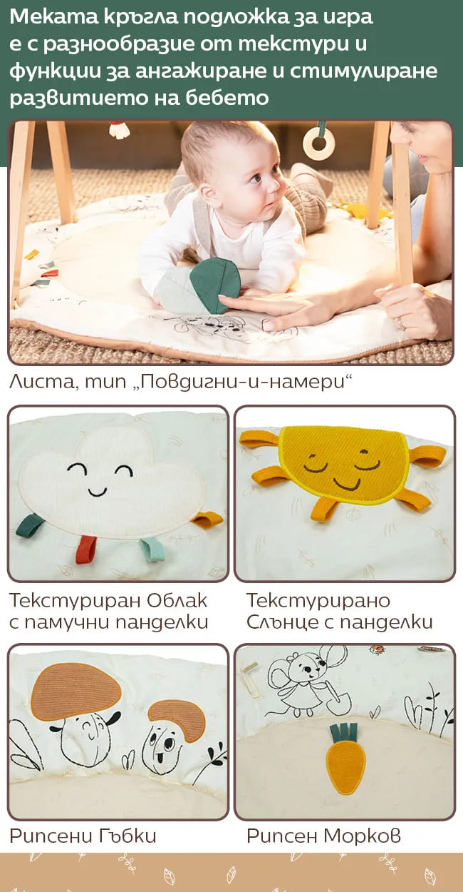 • 360° подложка за игра разполага с разнообразие от текстури и функции за ангажиране и стимулиране на бебето;