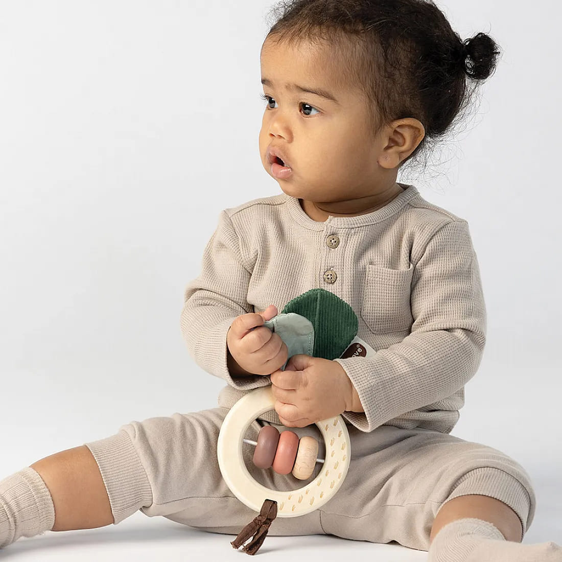 редлага тактилна, слухова и визуална стимулация на мъничето с нежни текстури, палитра от цветове и завладяващ дрънкащ звук;