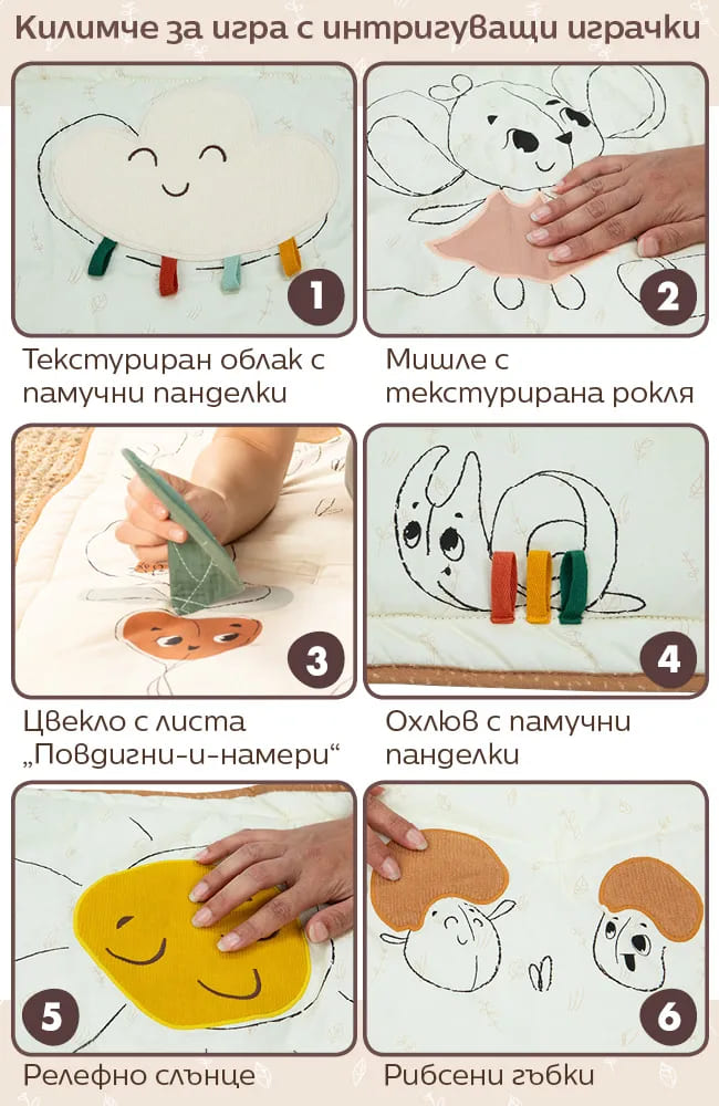 Мекото бебешко килимче стимулира сетивата, когнитивното развитие и двигателните умения на бебето;