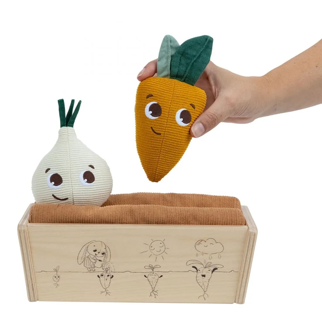 Играчките плодчета са изработени от памучни тъкани и пълнеж от рециклиран полиестер;