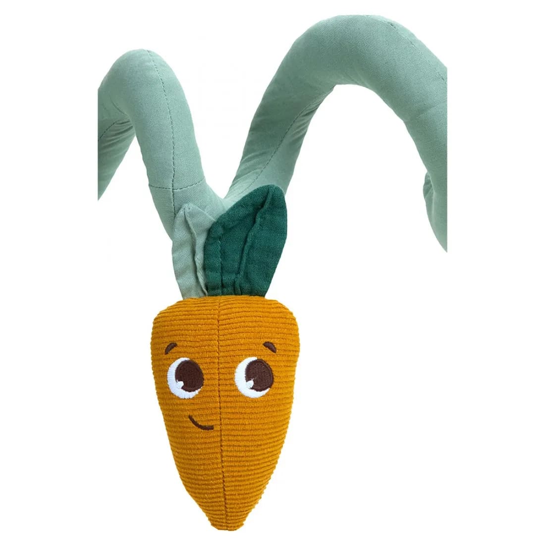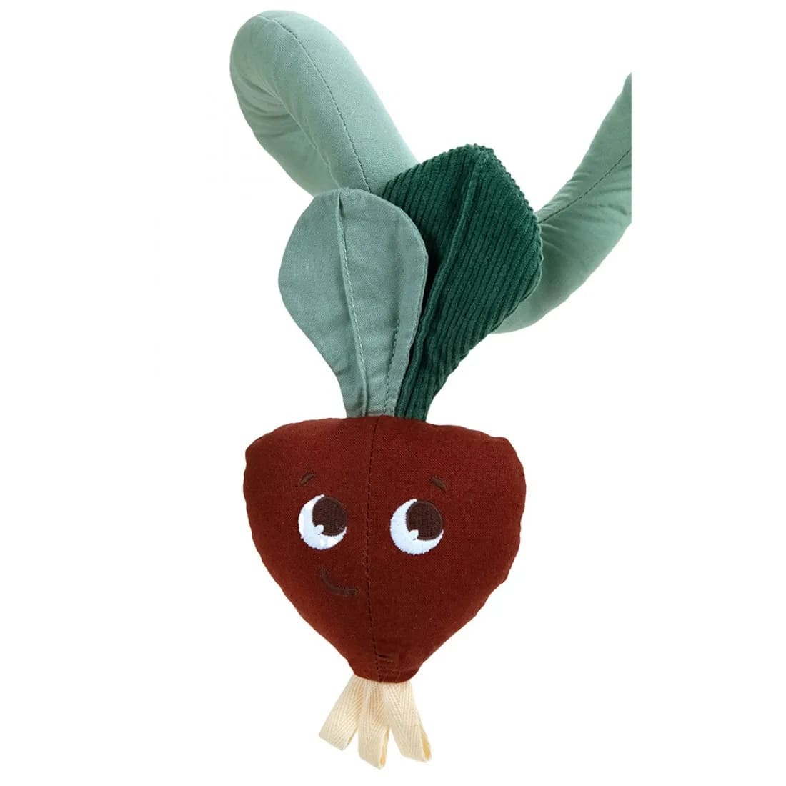 Играчка Цвекло с памучни панделки и текстурирани листа от муселин и памук – меки на допир текстури, които стимулират фината моторика;