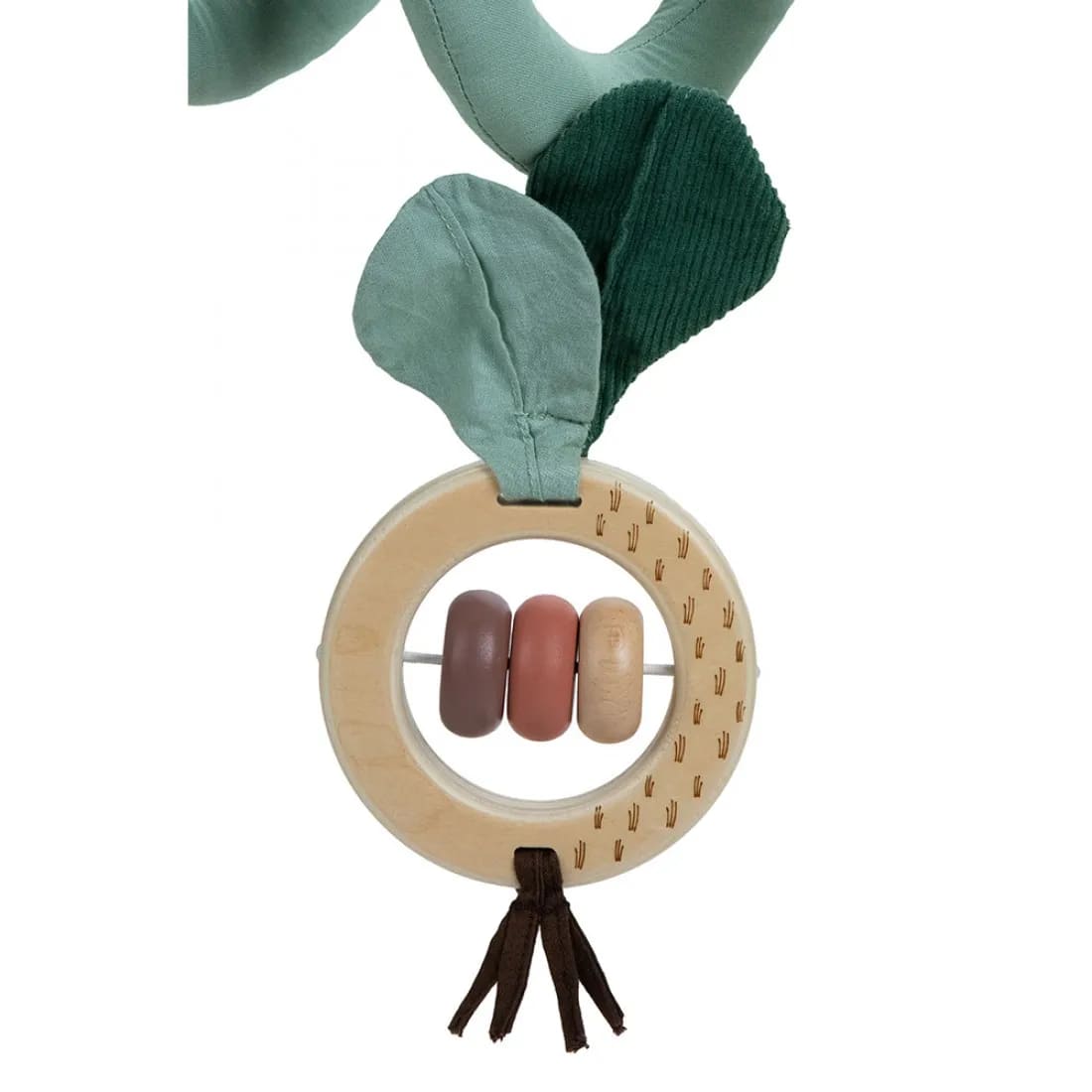 Дървена текстурирана дрънкалка с мъниста и текстурирани листа, насърчава развитието на слуховото възприятие и координацията;
