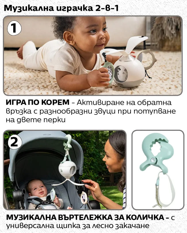 „Тих“ Режим: Успокояващ режим за игра без звук, който позволява на бебето да се наслаждава на въртенето на перките и на прозорчето с променящи се картинки;