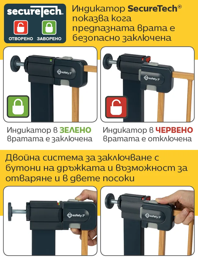 • Визуален индикатор SecureTech® показва кога предпазната врата е безопасно заключена (в червено - заключено, в зелено - отключено);