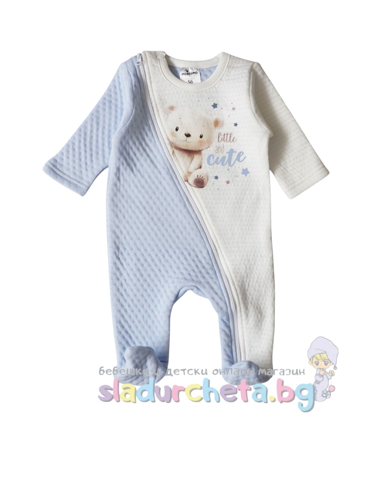 Гащеризонът е с дълъг ръкав в син и бял цвят с апликация на мече;