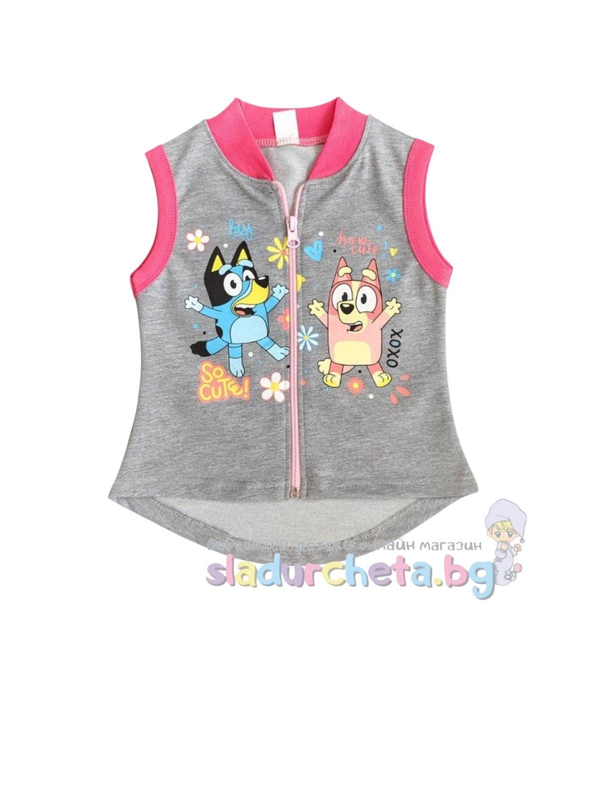 Елекът е в сив цвят с тъмнорозов кант и цветна апликация на Блуи;