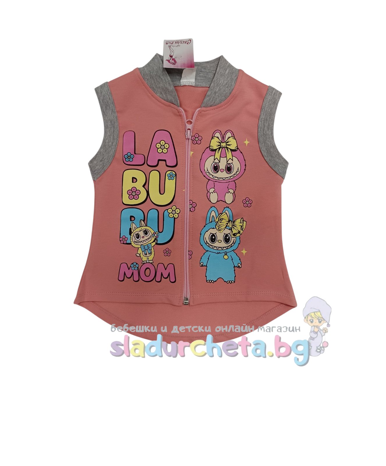 Елекът е в цвят праскова със сив кант и цветна апликация на Лабубу;