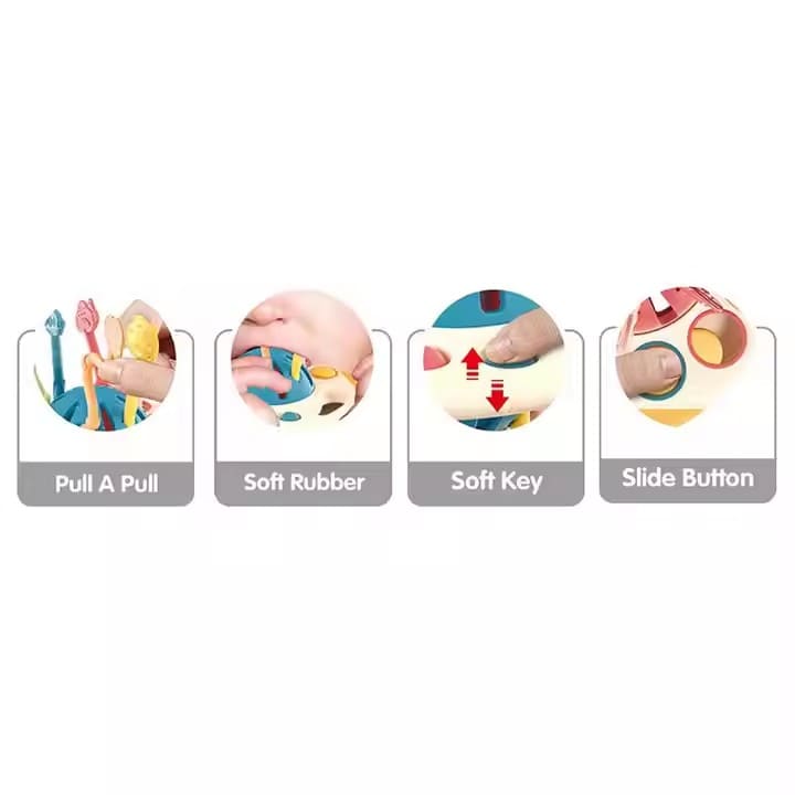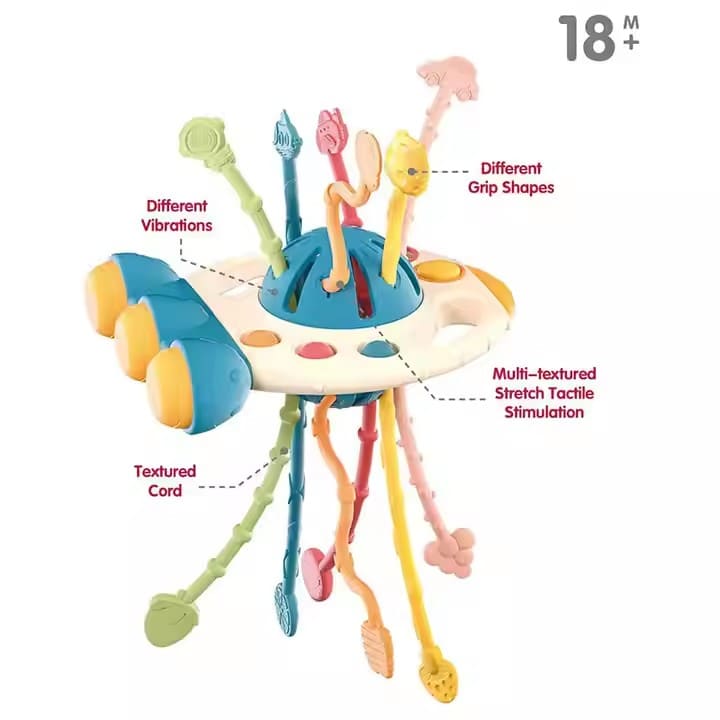 6 силиконови въженца с различни текстури, форми, вибрации– за развитие на фината моторика;
