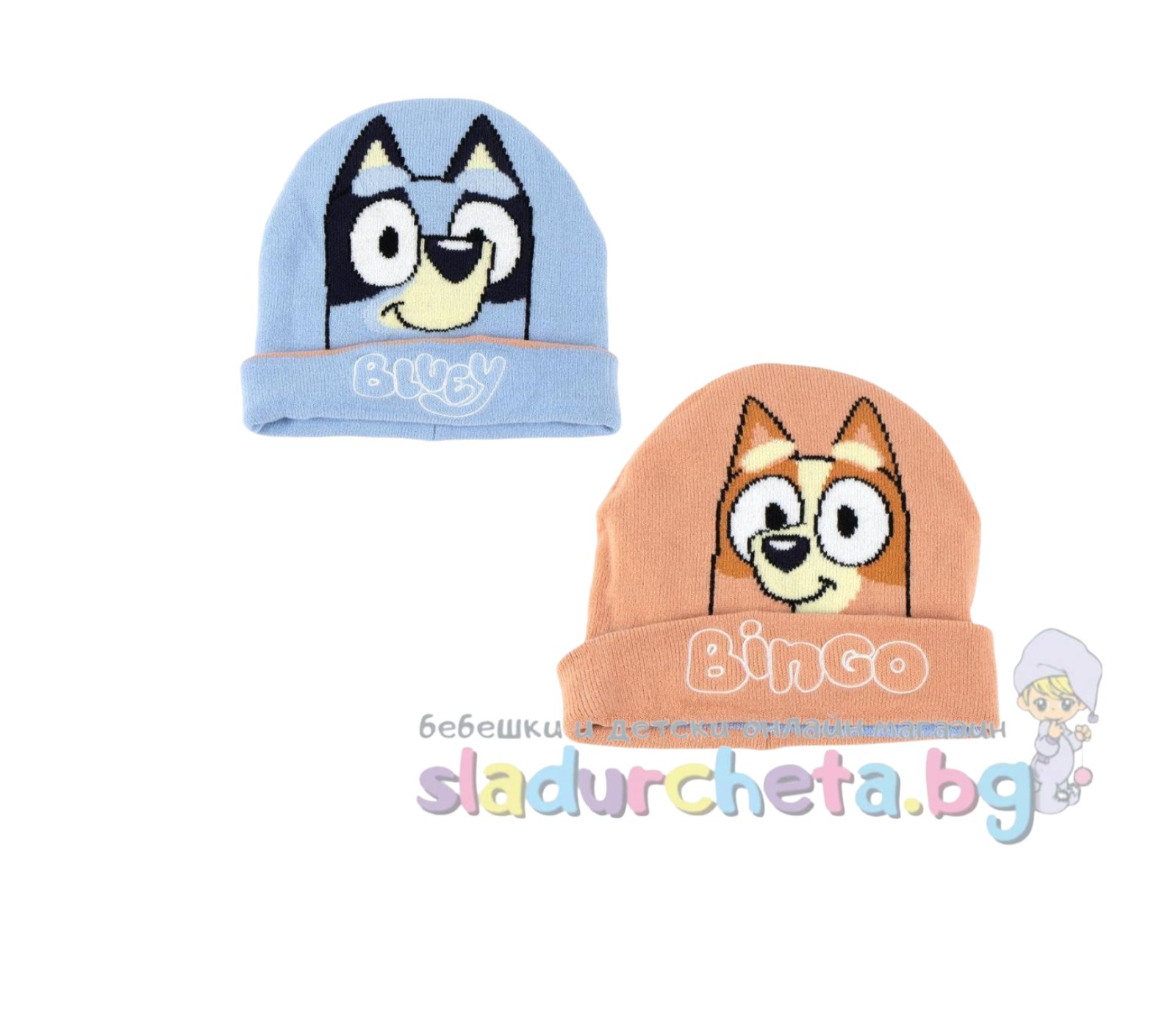 Шапката е двулицева в син/праскова цвят с цветна апликация на Блуи;