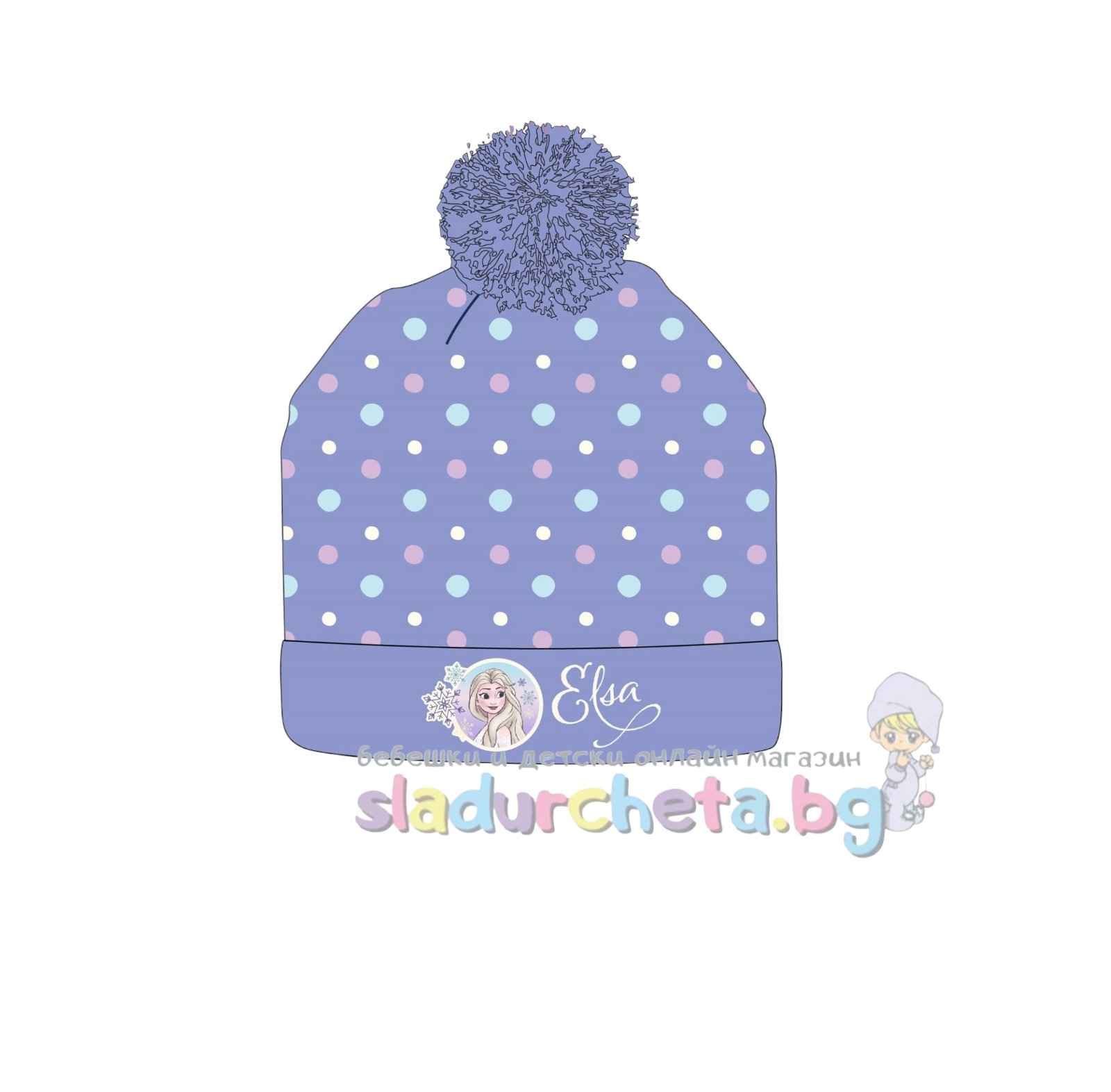 Шапката е в лилав цвят на цветни точки, с един помпона и акцент на Елза;