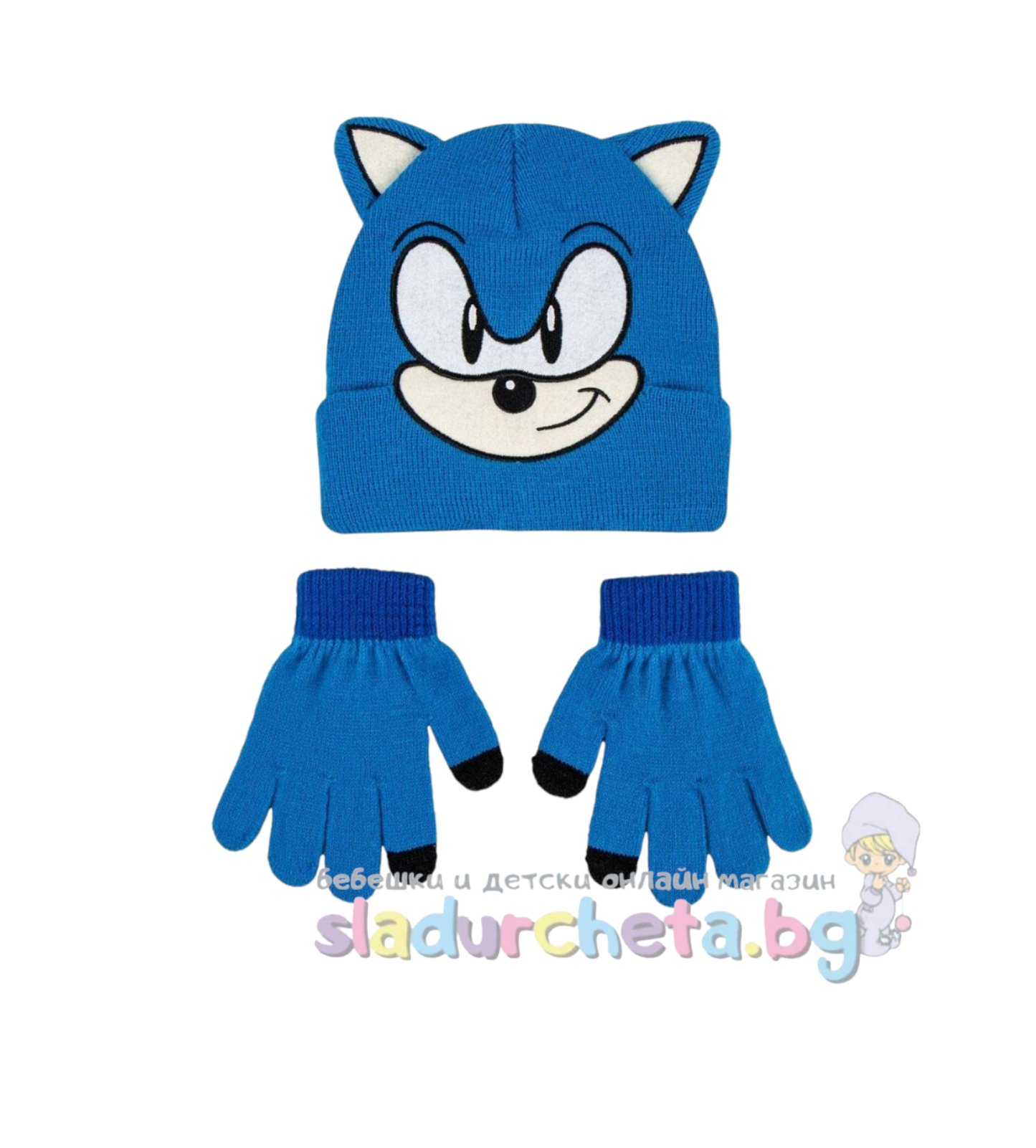 Шапката е в син цвят с цветна апликация на Соник с ушички;