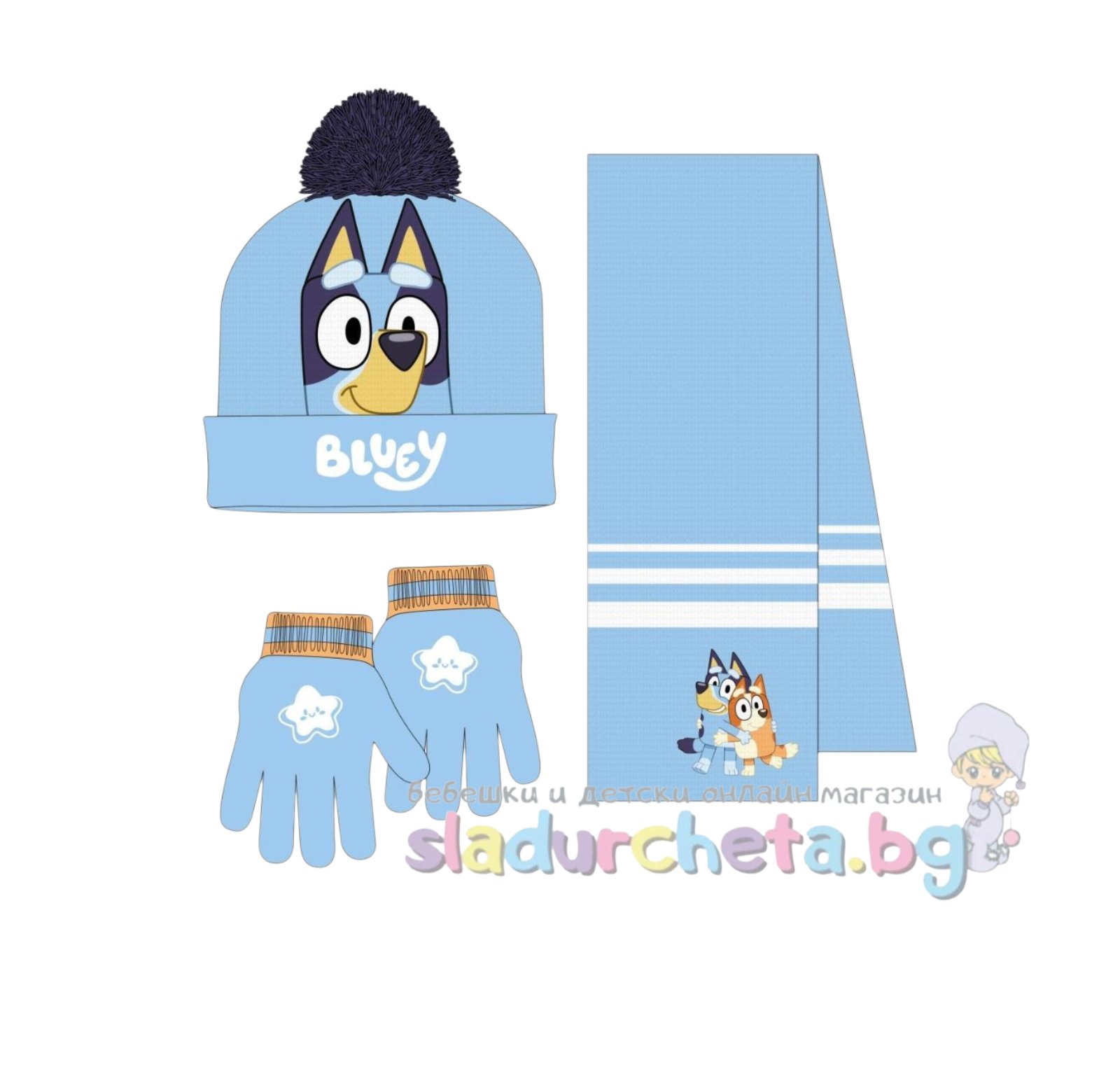 Шапката е в син цвят с цветна апликация на Блуи и един помпон;