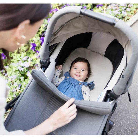 Сенникът е водоотблъскващ с UPF 50+ предпазва от слънчевата светлина и се прибира за лесен достъп до бебето;
