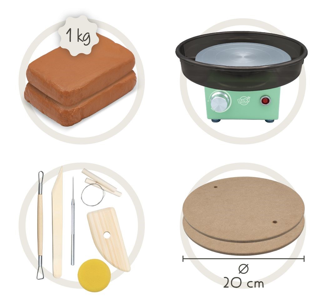 • Истинско грънчарско колело, което запознава деца и възрастни с техниките на точене, с включено илюстрирано ръководство;