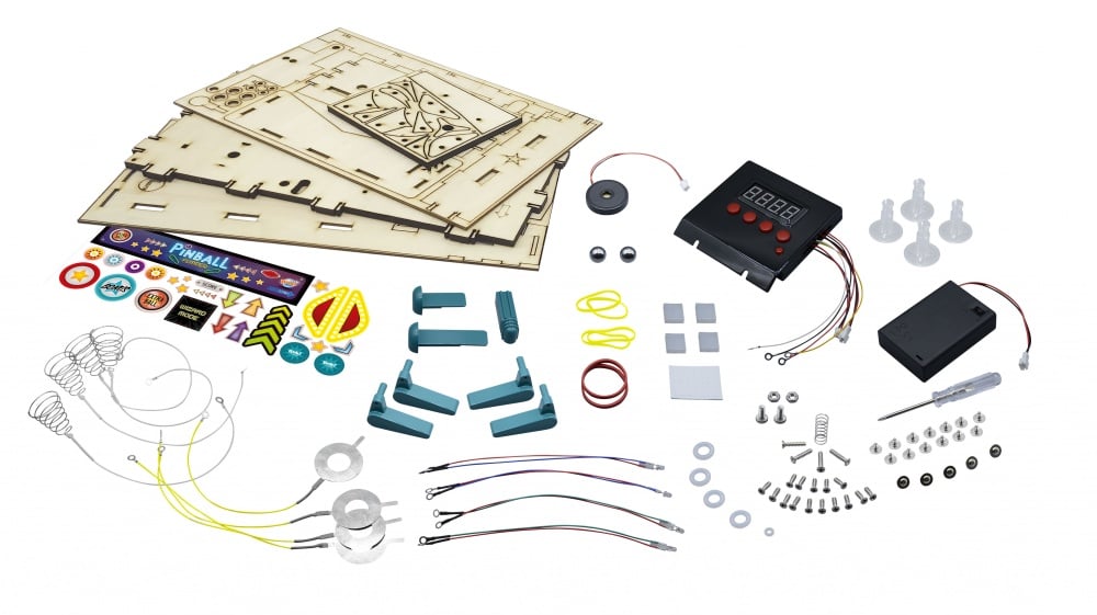 • Включени: 4 дървени панела, 1 електронно табло, 1 високоговорител, 1 отделение за батерии, 4 опори за броня, 4 пружини, 4 основи за броня, 2 зелени светодиода, 2 сини светодиода, 4 плавници, 1 дълъг бутон, 1 къс бутон, 1 бутало, 1 голяма пружина, 4 неплъзгащи се подложки, 2 топки, 4 големи шайби, 1 малка шайба, 1 лепило, 4 еластични ленти, 2 червени еластични ленти, 18 винта с фланец, 4 дълги винта, 4 дълги винта, 2 средни винта и 2 гайки, 15 къси винта, 1 отвертка и 1 лист със стикери;