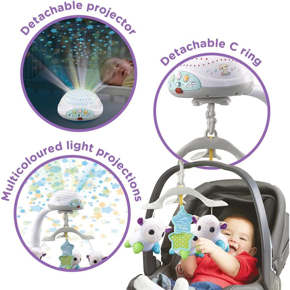 • Вашето мъниче може да гледа как три пухкави овце се въртят, докато успокояващо нощно небе се проектира на тавана в три различни цвята;
