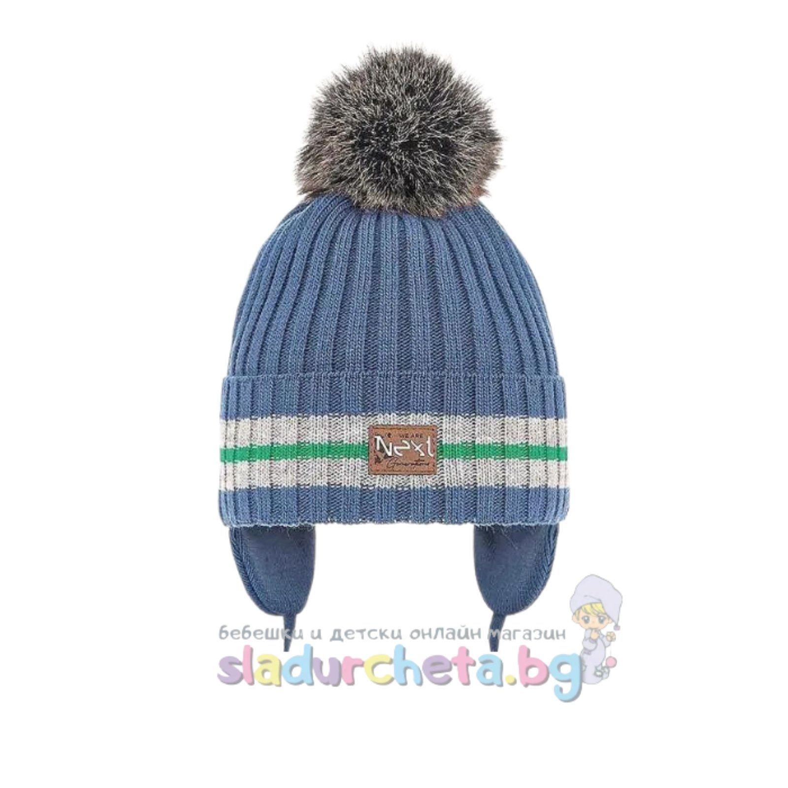Дълбока оребрена, плетена шапка в син цвят с акцент голям помпон и връзки;