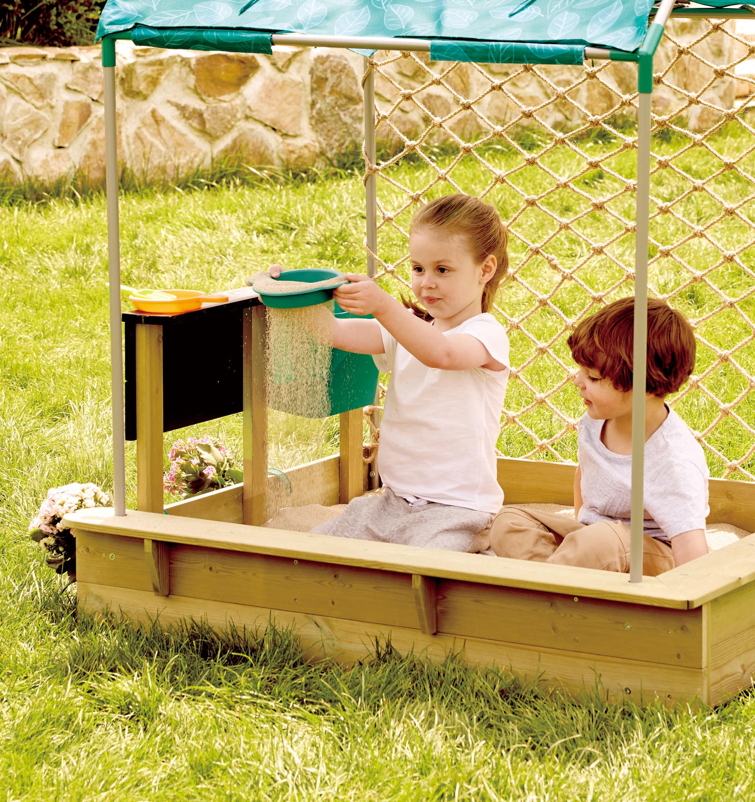 • Този универсален комплект съчетава пясъчник, кухня, саксия, статив и уютен, подвижен покрив;