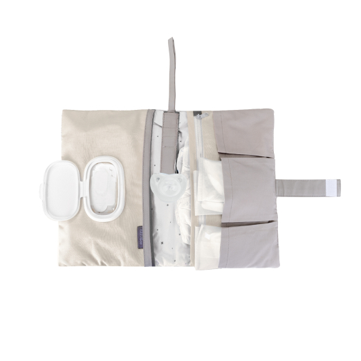 Отделение с отвор за мокри кърпи, джоб за памперси, джоб с цип и 3 отворени джоба за принадлежности;