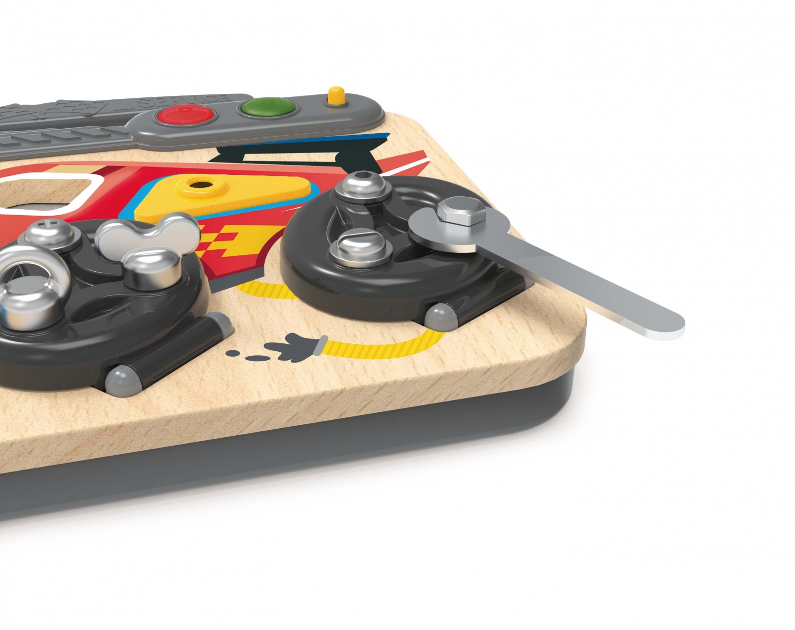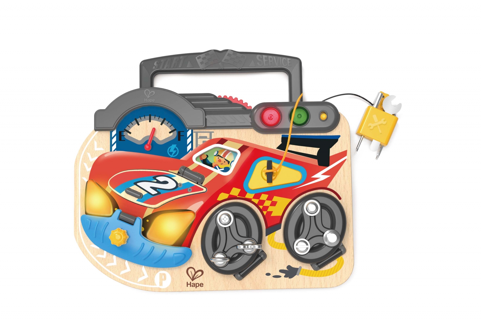 Оборудвана със седем различни вида винтове за гуми, подходящи за деца, заедно с други инструменти, тази състезателна дъска помага на децата да подобрят фините си двигателни умения, докато играят и растат;