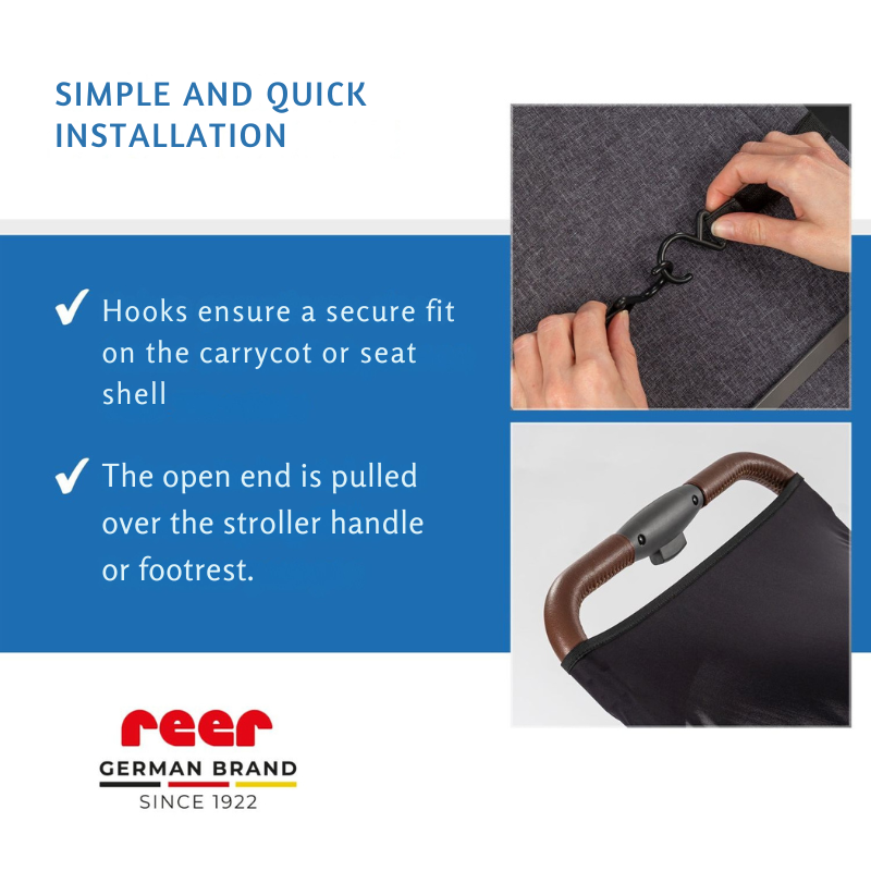 Бърз и лесен монтаж: Поставете слънцезащитния калъф върху коша за новородено или седалката. Закачете куките под коша за новородено или седалката. След това издърпайте другия край върху дръжката на количката;